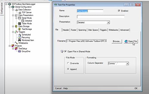 The trial software is the full product and can log to any supported file or database format with no tag count limits. Once the OPC Data Logger starts logging, it will stop after 2 hours. You can restart it but all logging will stop after 30 days.