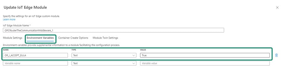 Then give your instance a friendly IoT Edge Module Name applicable to your process, and click on "Environment Variables" and enter "True" for the value for "OR_I_ACCEPT_EULA" and click Update (button not shown but at bottom of the Azure page).  OPC Router EULA available for review here.